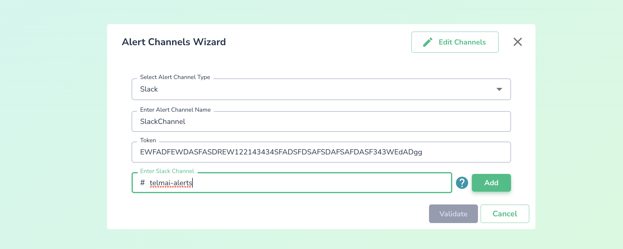 Enter the slack channel you want to receive alerts. (You can add multiple channels by clicking on “Add”)